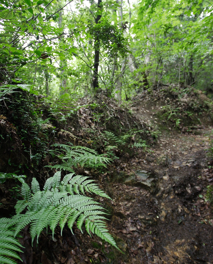 昔の登山道。国道20号から1号路途中の金比羅台に接続。荒れた登山道は自然が多く、整備された1号路とは対照的で、人も少ない。